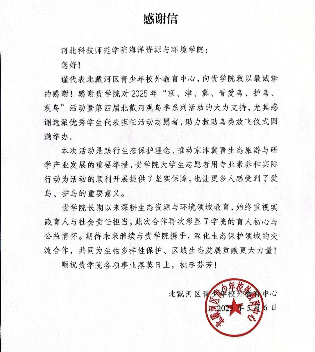 近日,suncitygroup太阳集团收到了来自北戴河区青少年校外教育中心的感谢信,信中对学院助力2025年“京、津、冀、晋爱鸟、护鸟、观鸟”活动暨第四届北戴河观鸟季系列活动的大力支持表达了诚挚谢意。